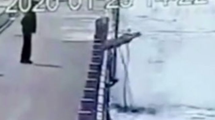 Maskesini takan Çinli bir adam, Şansi eyaletinin Linfen şehrindeki nehir üzerinde yürürken, sütunlara tekme attı.