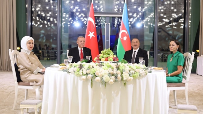 Erdoğan, eşi Emine Erdoğan ile birlikte Cumhurbaşkanı İlham Aliyev ve eşi Mihriban Aliyeva akşam yemeğinde bir araya geldi.