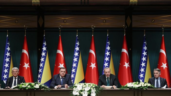 Basın toplantısında konuşan Bosna Hersek Devlet Başkanlığı Konseyi Başkanı Milorad Dodik, Cumhurbaşkanı Erdoğan'a ülkesi olarak minnettar olduklarını söyledi.