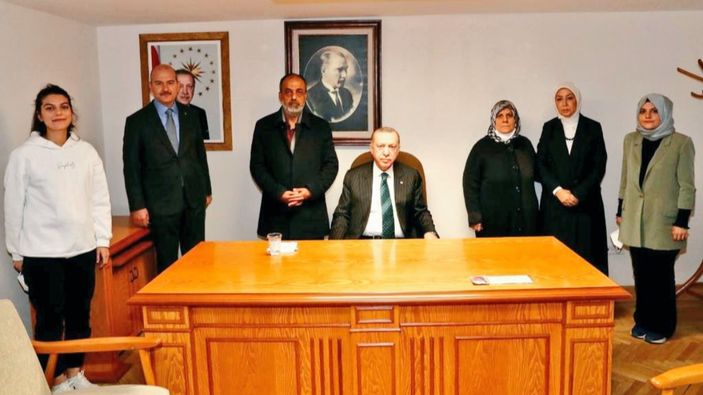 AK Parti Malatya Milletvekili Öznur Çalık'ın paylaştığı fotoğrafta, Cumhurbaşkanı Erdoğan ve İçişleri Bakanı Süleyman Soylu ile şehidin ailesi yer aldı.