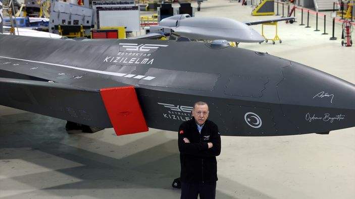 Cumhurbaşkanı Erdoğan, Bayraktar KIZILELMA İnsansız Savaş Uçağı önünde çektirdiği hatıra fotoğrafını paylaştı.