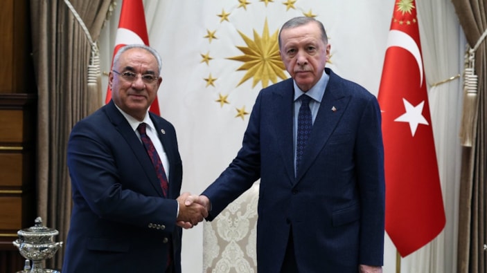 Cumhurbaşkanı Recep Tayyip Erdoğan, Demokratik Sol Parti Genel Başkanı Önder Aksakal'ı Cumhurbaşkanlığı Külliyesi'nde kabul etti.