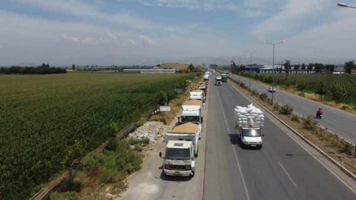Hatay'ın Kırıkhan ilçesinde üreticiler, ürünlerini lisanslı depolara teslim etmek için araç kuyruğu oluşturdu. Kuyruk, drone ile görüntülendi.