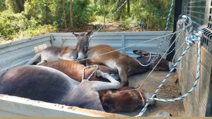 Hayvanseverler tarafından kayda alınan ve fotoğrafa yansıyan uygulamada, eşeklerin iğne ile uyuşturularak açık kasa bir kamyonetin arkasında yere yatırıldığı, bacakları ve boyunları bağlanarak taşındığı görüldü.