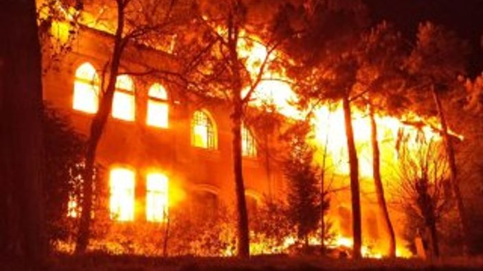 Ekiplerin müdahalesine rağmen tarihi okul, harabeye döndü.