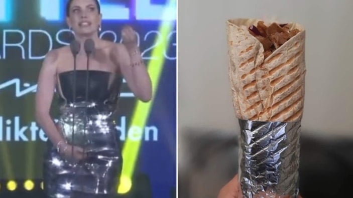 Söylediklerinin yanı sıra giydiği kıyafetle de konuşulan Eda Ece, alüminyum folyoya sarılmış dönere benzetildi.