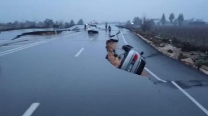 Depremin ardından yolun yarıldığı ve seyir halindeki araçların, göçüğün içine devrildiği görüldü.