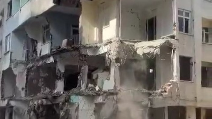 6 Şubat depremlerinden etkilenen bölgede 5 katlı hasarlı binanın yıkımında ses dalgalarından destek alındı. O anlar kameralara yansıdı.