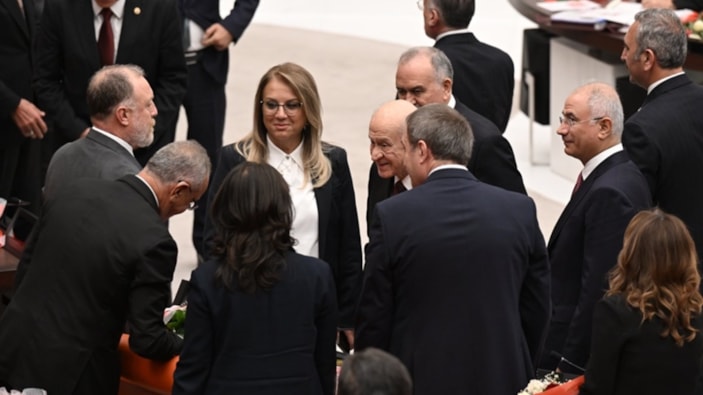 Milliyetçi Hareket Partisi (MHP) Genel Başkanı Devlet Bahçeli, Meclis'in açılış tönreninde DEM Parti Grubu'yla da tokalaştı.