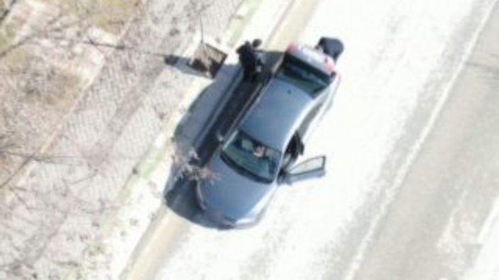Kent merkezinde trafik ekiplerinin gerçekleştirdiği uygulama noktalarına yaklaşık 100 metre kala, sürücü belgesiz ve sürücü belgesi geri alındığı halde araç kullanan kişiler araç içinde ve dışında yer değişikliği yaptıkları anlar drone kamerasına yansıdı.