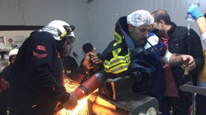 İtfaiye ekibi, ayakta olan işçinin makinaya sıkışan elinin çıkarılamaması üzerine demir kesme makinasını kullanma kararı aldı. Bu sırada sağlık ekibi de işçiye, bilincini kaybetmemesi için diğer kolundan serumla ilaç verdi.