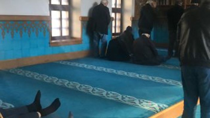 Selamiali Fahreddin Tivnikli Camii'nde, önceki günlerde sabit oturakları kullanan yaşlı cemaat ise yere oturarak namazını kıldı.