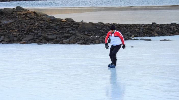 O anları kamerasıyla da anbean kayıt altına alan Atila, donan göl üzerinde yaklaşık 1 saat buz pateni yaptı.