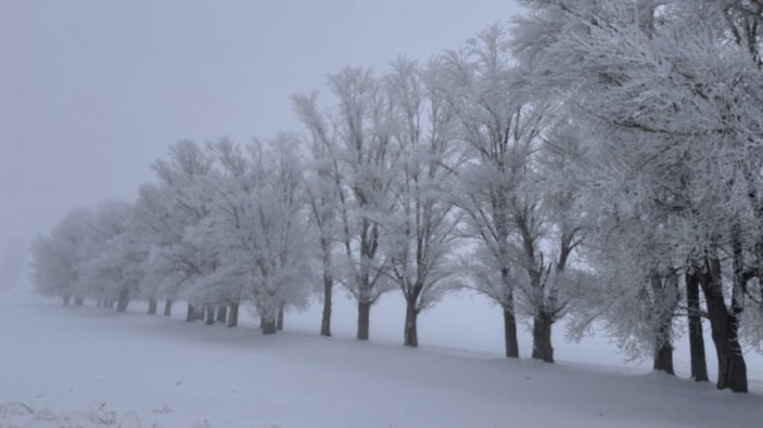 Sis ve soğuk havanın ardından oluşan kırağı, ağaçları beyaza bürüdü.