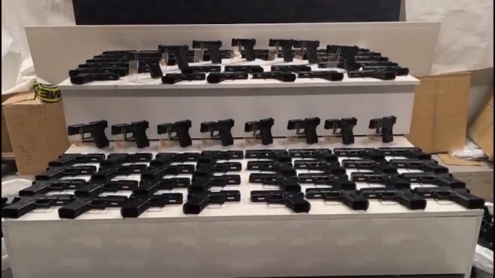 Çekici üzerinde arızalı görüntüsü verilmiş hafif ticari araçta yapılan aramada; poşet ve çuvallara doldurulmuş parçalanmış halde toplam 480 tabanca, 518 namlu rampası, 491 silah sürgüsü, 492 şarjör, 488 namlu, 479 gövde, 494 tetik mekanizması, 469 icra yayı, 490 icra mili, 2891 muhtelif silah parçası ele geçirildi.