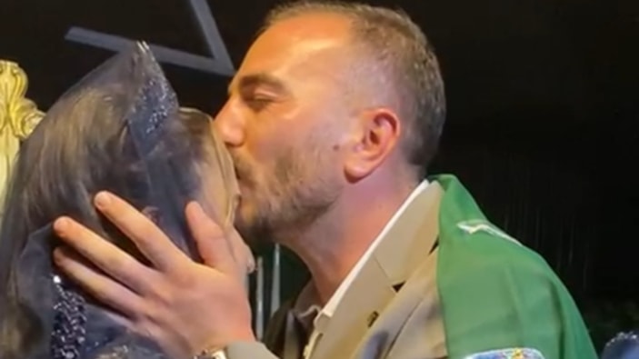 Oldukça mutlu olduğu görünen ve yakınları tarafından cep telefonuyla kaydedilen görüntülerde Tolunay Kocaman’ın, eşinin alnından öptüğü görülüyor.