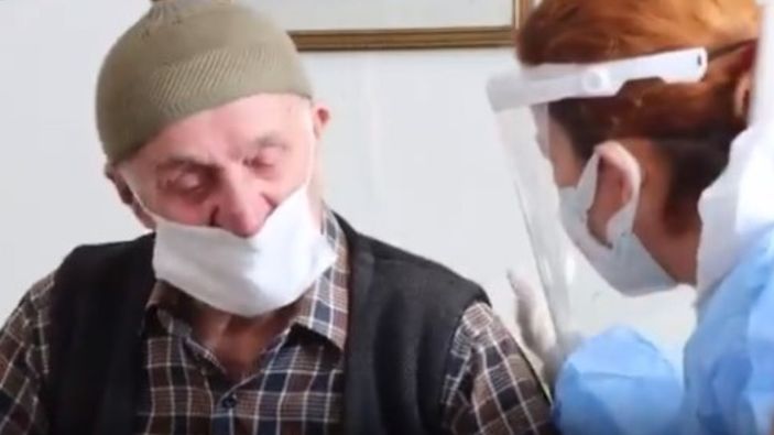 Sağlık Bakanı Fahrettin Koca, filyasyon ekiplerinin aşı yaptığı 90 yaşındaki Selim Böcükler'in görüntülerini paylaşı. Koca, paylaşımını "Devletimiz var olsun." notuyla yaptı.