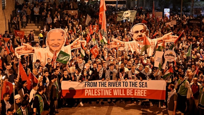 Kalabalık, ABD Başkanı Joe Biden ve İsrail Başbakanı Binyamin Netanyahu'nun maketlerini taşıyarak, Türkçe ve İngilizce sloganlarla İsrail'in Gazze'ye yönelik saldırılarını protesto etti.