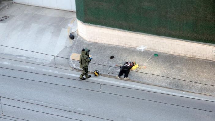Akabinde görevli memurlar tarafından gerekli reaksiyon gösterilerek şüpheli silahla etkisiz hale getirilmiştir. Bomba imha ekiplerimizce yapılan çalışmada sahte bomba düzeneği tespit edilmiş, şüphelinin canlı olarak sağlık kuruluşuna sevki sağlanmıştır.