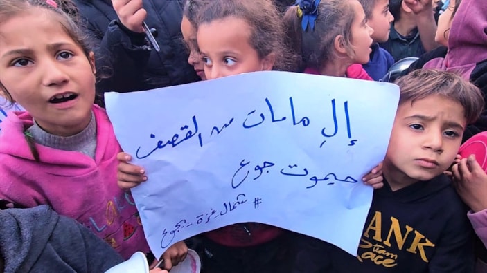 İsrail ordusunun Gazze'ye yönelik saldırıları devam ederken, Cibaliye Mülteci Kampı'na sığınan Filistinli çocuklar ellerinde "Saldırılarda ölmeyen açlıktan ölecek" pankartlarıyla dolaştı.
