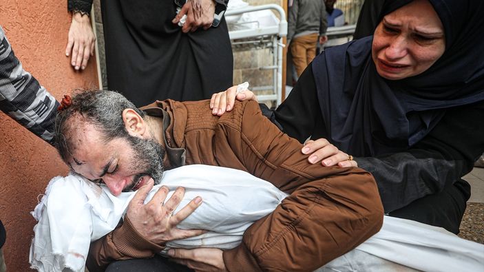 Saldırılarda hayatını kaybeden Ağa ailesinden 2 çocuğun naaşı, baba Jemil ve eşi tarafından toprağa verilmek üzere Han Yunus kentindeki Nasır Hastanesi morgundan alındı. Baba Jemil ve eşinin hüzün dolu anları fotoğraf karesine yansıdı.