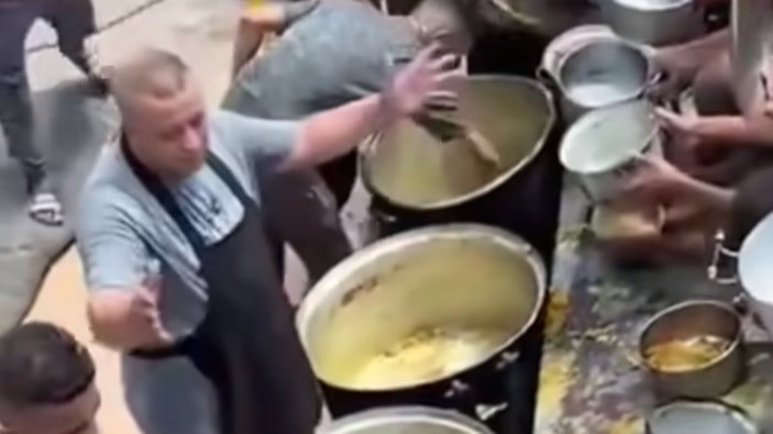 Yemek dağıtırken boş kazanı görüp önündeki kalabalığı eli boş geri göndermek zorunda kalacağını anlayan görevlinin yaşadığı çaresizlik kameralara yansıdı.