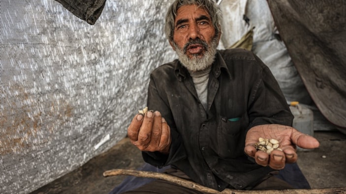 İsrail saldırıları nedeniyle Gazze'nin kuzeyindeki Beyt Lahya'dan Yermuk Kampı'na göç eden Filistinli Abdülhadi Subh, gıda kıtlığının yaşandığı kentte eşi ve çocuklarıyla birlikte atık yemekleri topluyor.