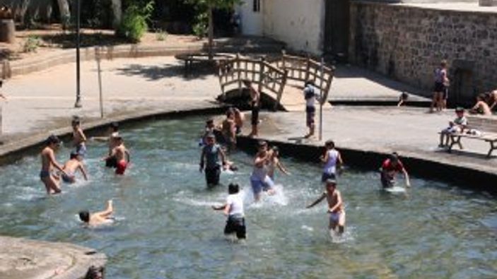 Diyarbakır'da vatandaşlar, tarihi sur diplerinde gölgede serinlemeye çalışıyor. Sur ilçesinde Anzele'deki süs havuzlarına giren çocuklar da bir yandan serinlerken, bir yandan da arkadaşlarıyla oynayarak eğleniyor.
