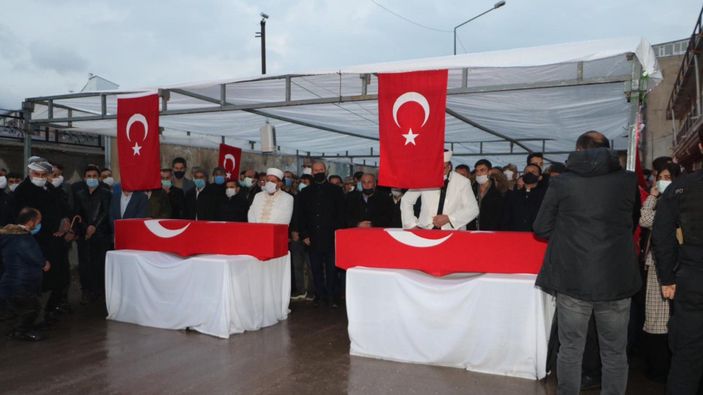 Türk bayrağına sarılı tabutların, tören alanına getirilmesinden sonra şehitler için saygı duruşunda bulunulup dua okunurken, yakınları ise tabutlara sarılarak feryat etti.