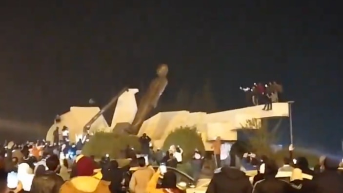 Heykelin vinçlerle yıkıldığı anlardaki coşku kameralara yansıdı.
