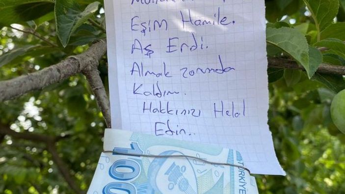 Bursa'nın İznik ilçesinde aşeren hamile eşi için tarladaki ağaçtan erik toplayan bir kişi, ağaca 100 lira para asıp bir de not bıraktı.