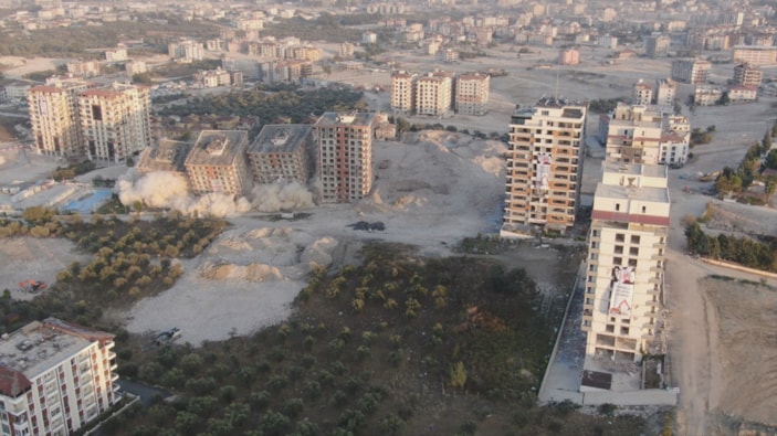Depremin vurduğu Hatay’da 10 bina dinamitle patlatılarak aynı anda yıkıldı. Dron ile havadan da görüntülenen 640 adet milyonluk konuttan geriye enkaz kaldı.