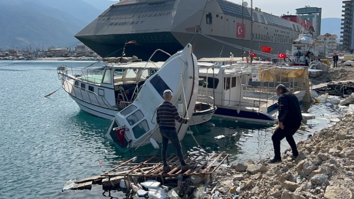 Hatay'da kuvvetli fırtınayla alabora olan tekne vinçle kurtarıldı