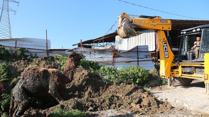 Düştüğü kanalda kurtarılmaya bekleyen deve, itfaiye ekiplerinin halat ve kepçe desteğiyle çıkarıldı.