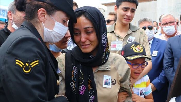 Törende, şehidin babası ve asker kıyafeti giyen eşi ile çocukları 14 yaşındaki Basri ve 9 yaşındaki Alper Akgöz, tabutun önünde bulunan şehidin fotoğrafına sarılarak gözyaşı döktü.