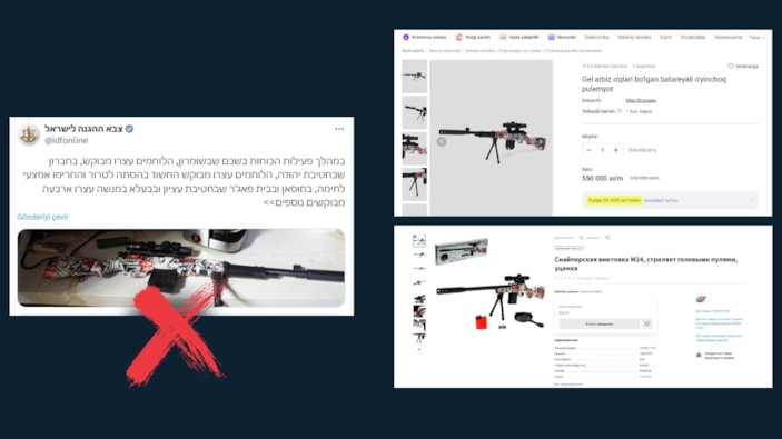 "Bahse konu paylaşımdaki fotoğrafta tüfek olduğu iddia edilen silahın, aslında oyuncak olduğu ve birçok oyuncak sitesinde satışta olduğu belirlenmiştir. İsrail'in Gazze'de işlediği soykırımı meşrulaştırmak ve dünya kamuoyunu manipüle etmek amacıyla yürüttüğü propaganda kampanyasına itibar etmeyiniz."