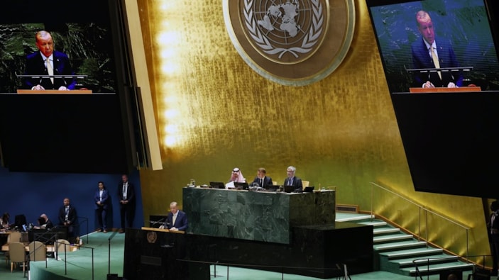 Cumhurbaşkanı Recep Tayyip Erdoğan, BM Genel Kurul Salonu'nda düzenlenen Filistin Meselesine Çözüm Bulunması ve İki Devletli Çözümün Hayata Geçirilmesi Konulu Yüksek Düzeyli Uluslararası Konferansı'na katıldı.