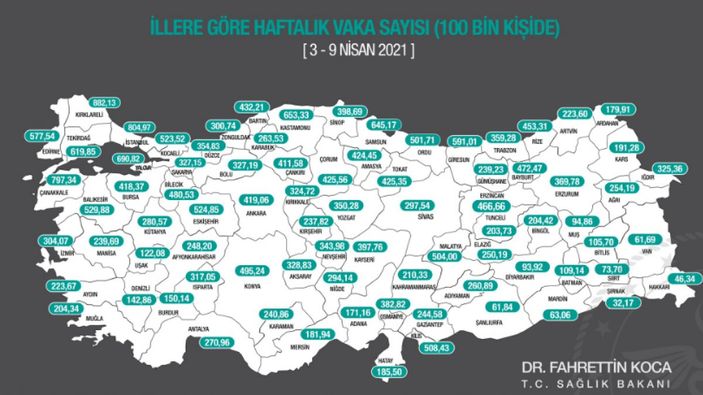 Sağlık Bakanı Fahrettin Koca, 3-9 Nisan arasında illere göre her 100 bin kişide görülen koronavirüs vaka sayılarını açıkladı.