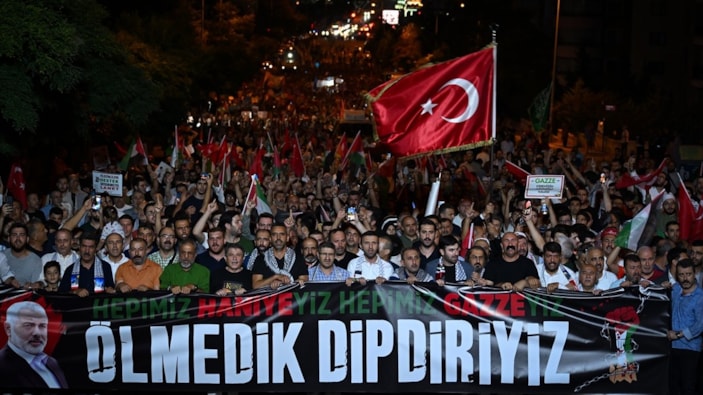 Hamas Siyasi Büro Başkanı İsmail Heniyye'nin İran'ın başkenti Tahran'da suikasta uğramadan önce Filistinlilere destek için yaptığı çağrı doğrultusunda başkentte binlerce kişi, ABD'nin Ankara Büyükelçiliği önünde toplandı.