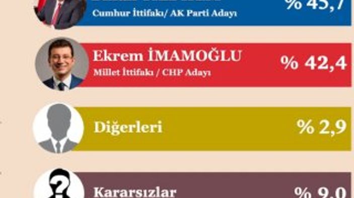 Araştırmada, vatandaşa ‘Bugün İstanbul Büyükşehir Belediye Başkanlığı seçimi olsa hangi adaya oy verecekleri’ soruldu. Yüzde 45,7’lik kesim AK Parti'nin adayı Binali Yıldırım, yüzde 42,4’lük kesim CHP’nin adayı Ekrem İmamoğlu dedi.