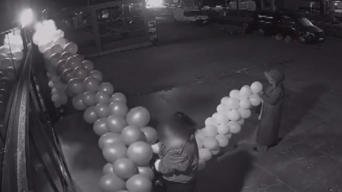 Sultangazi'de 2 kadın kampanya nedeniyle süslenen bir restoranın girişindeki balonları kopararak uzaklaştı. Kadınların balonları çaldığı anlar güvenlik kamerasına yansıdı.