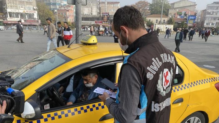 Aksaray Metro İstasyonu önündeki denetim noktasının gerisinde konuşlanan sivil ekipler, kurallara uymayan taksicileri tespit etti.