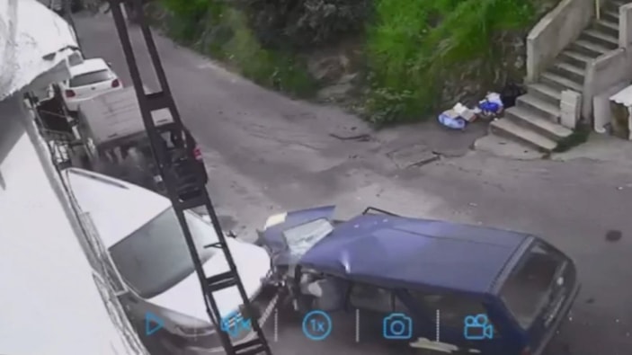 Kaza anı güvenlik kamerasına saniye saniye yansıdı. Görüntülerde, yokuş aşağı hızla gelen otomobilin park halindeki hafif ticari araca vurduktan sonra aracı bir süre sürüklediği görülüyor.