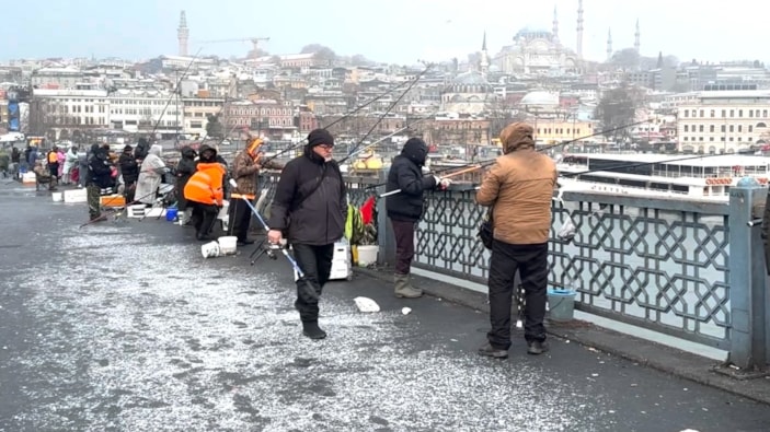 İstanbul'da balıkçıklar kar soğuk dinlemedi: Galata Köprüsü'nde "rastgele" dedi