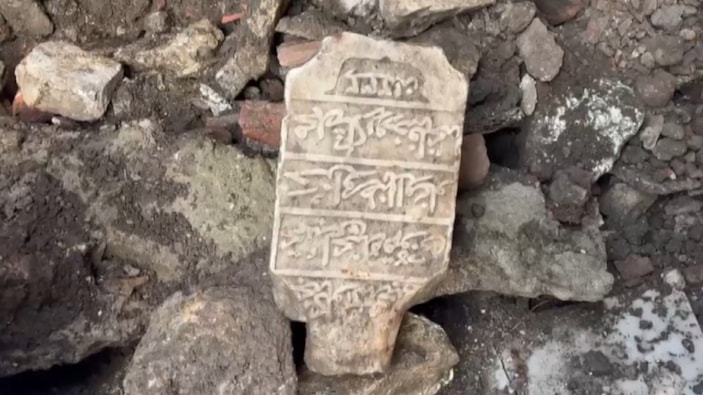 İhbar üzerine adrese gelen belediye ekipleri, kısmen çöken duvarın molozlarının arasında 1232 yılına ait olduğu değerlendirilen mezar taşını buldu.