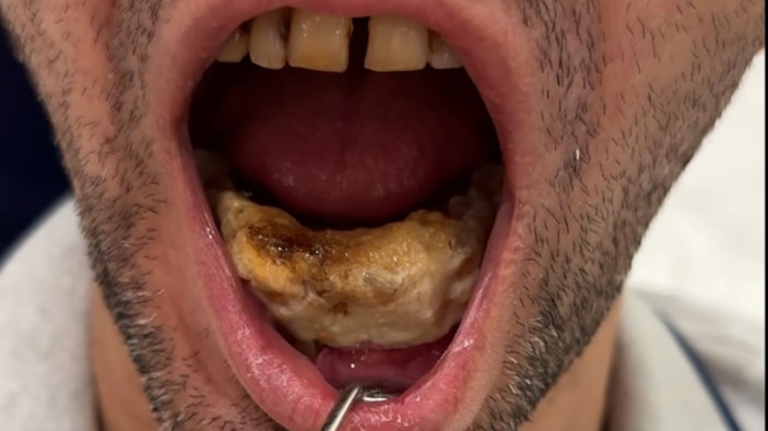 Sallanan dişlerini yapıştırmak için katman katman Japon yapıştırıcısı süren adamın ağzının halini gören diş hekimi, 'Bu kansorejendir, bu yapılır mı böyle?' ifadelerini kullandı.