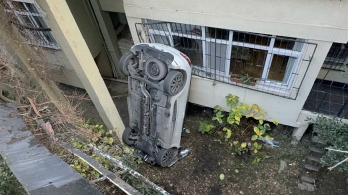 Araç, yaklaşık 6 metre yükseklikten bir sitenin bahçesine düştü.
