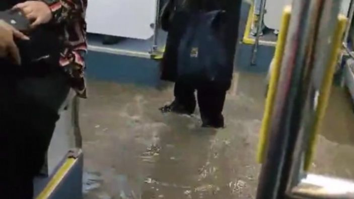 Yolculardan birinin cep telefonu kamerasına yansıyan görüntülerde seyir halindeki İETT otobüsünün içerisine yağmur suları doldu.