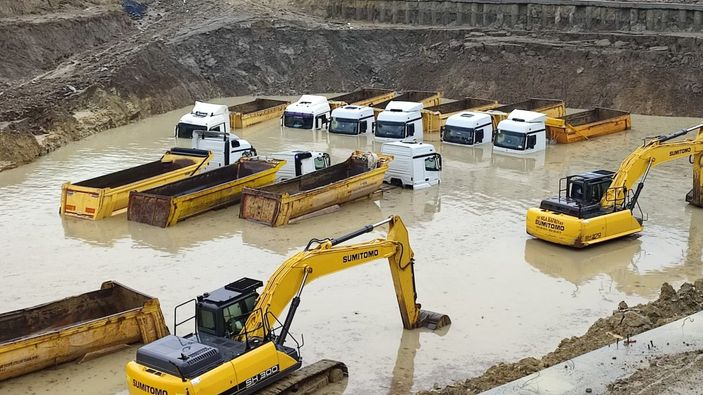 Bayram tatili nedeniyle şantiye alanına bırakılan 11 hafriyat kamyonu ve 4 iş makinesi de tamamen yağmur suyu altında kaldı.