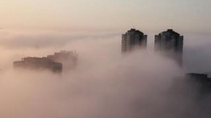 Sis nedeni ile yüksek binaların bir bölümü adeta görünmez olurken kartpostallık görüntüler oluştu.